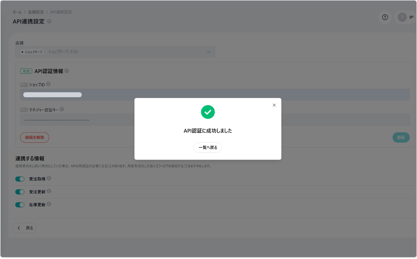 連携が完了すると、「API認証に成功しました」と表示されます。