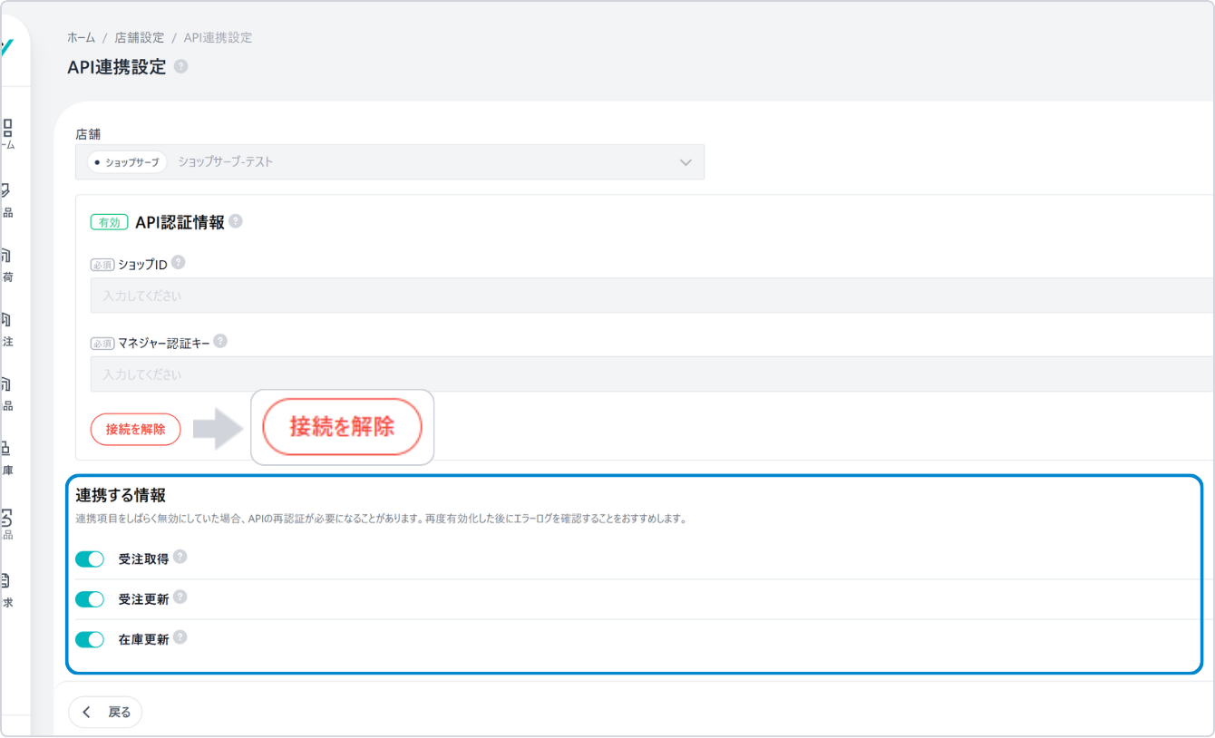 [接続を解除] ボタンをクリックすると、API接続情報を削除できます。連携する情報 の操作手順については、