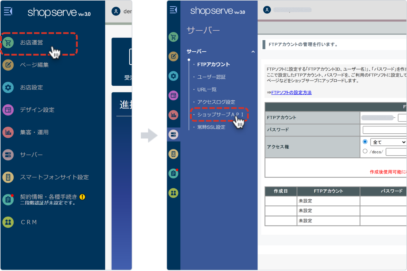 ショップサーブ管理画⾯にログインし、左側のメニューから、[サーバー] → [ショップサーブAPI] をクリックします。
