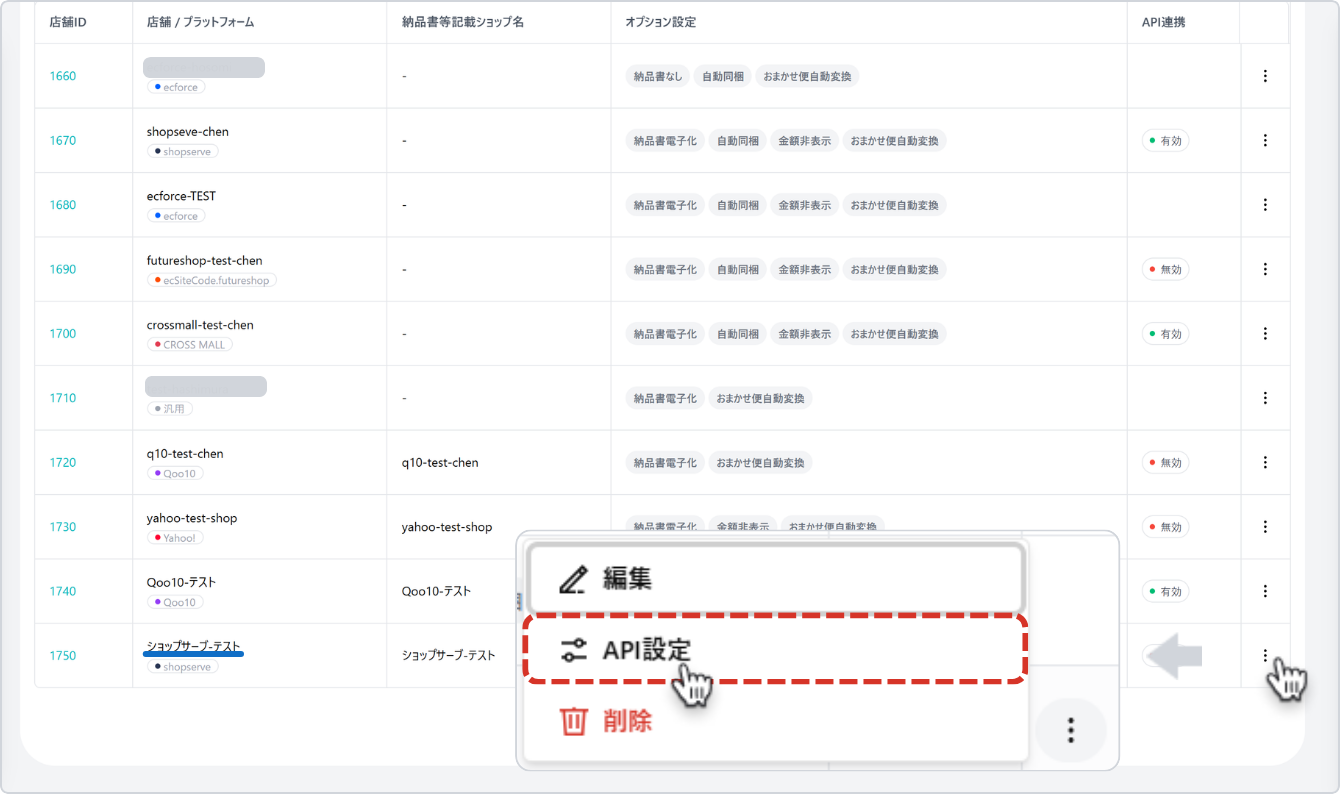 連携する店舗の行右端にあるMoreボタン [︙] をクリックし、表示された操作メニューから「API設定」を選択します。