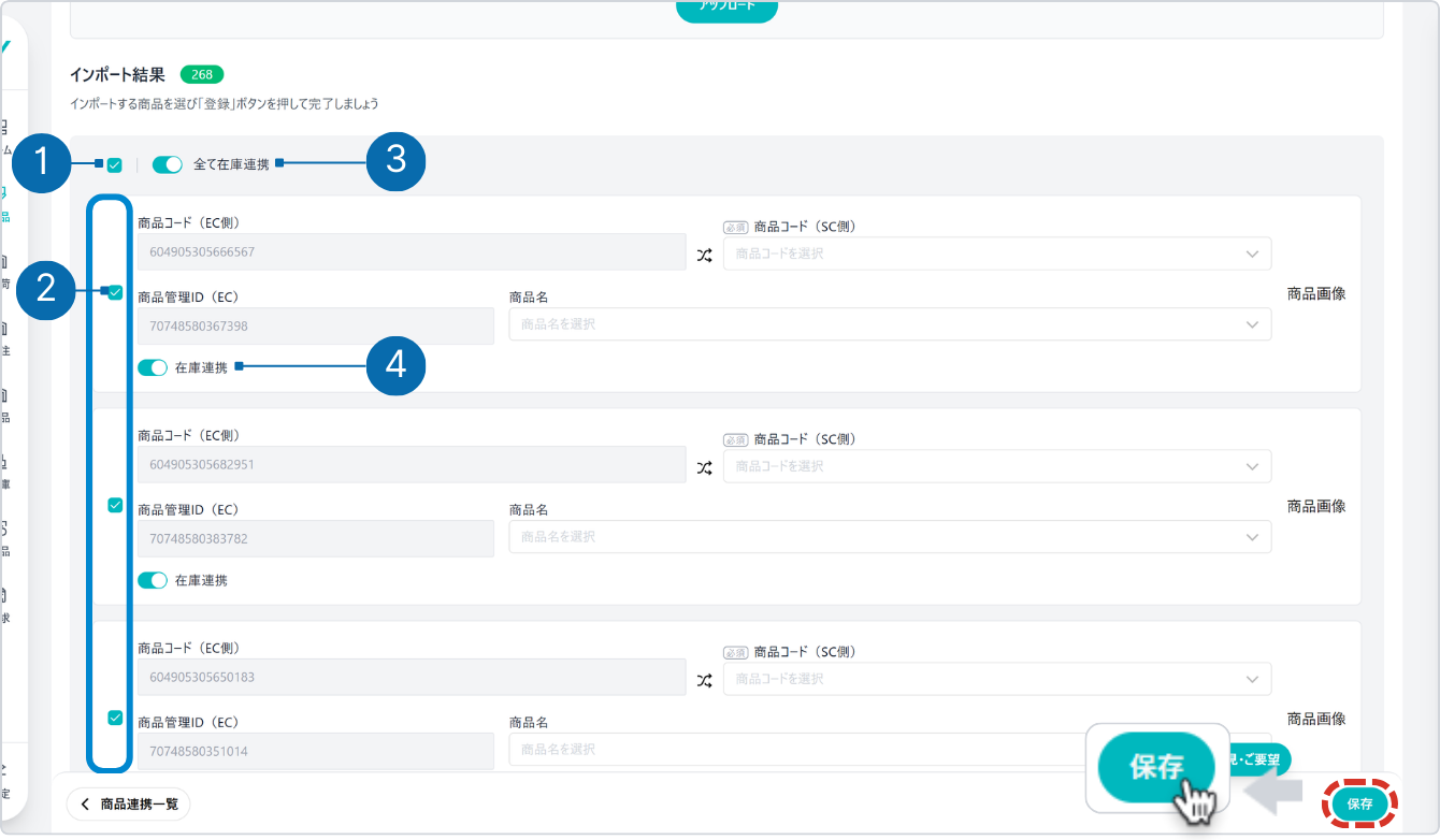 インポート結果にて、以下のいずれかの操作で登録する商品や在庫連携のON/OFFを指定し、画面右下の [保存] ボタンをクリックします。
