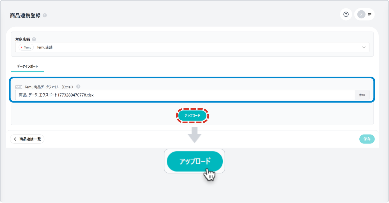 対象店舗を選択後、Temuから取得済みのファイルを指定し、[アップロード] ボタンをクリックします。