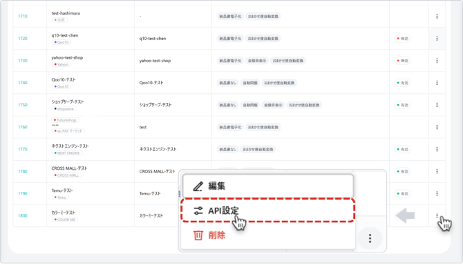 連携する店舗の行右端にあるMoreボタン [︙] をクリックし、表示された操作メニューから「API設定」を選択します。