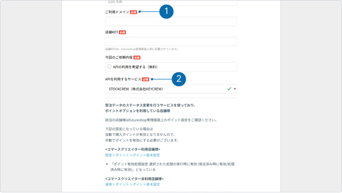 ① ご利用ドメイン:futureshop管理画面URLに含まれる、店舗を表す文字列を入力してください。