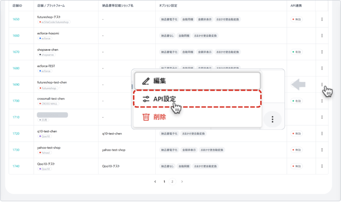 連携する店舗の行右端にあるMoreボタン [︙] をクリックし、表示された操作メニューから「API設定」を選択します。