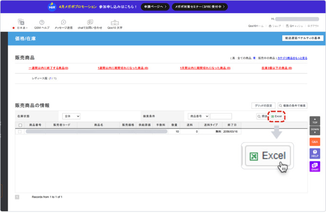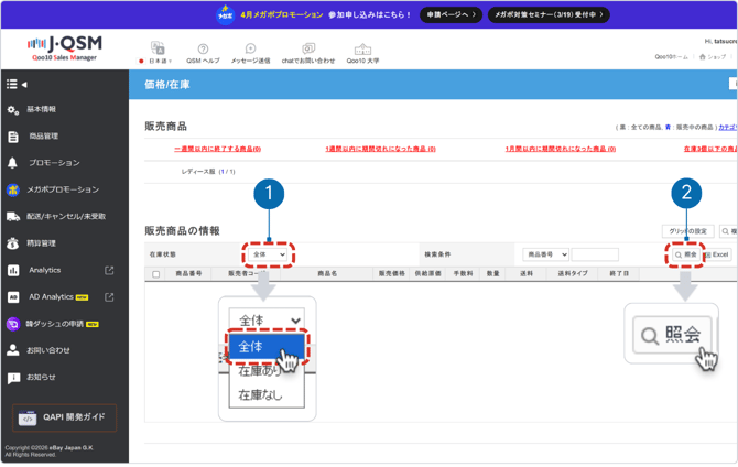 (https://qsm.qoo10.jp/GMKT.INC.Gsm.Web/Order/OrderManagement.aspx)にアクセスすると、「価格/在庫」画面が表示されます。