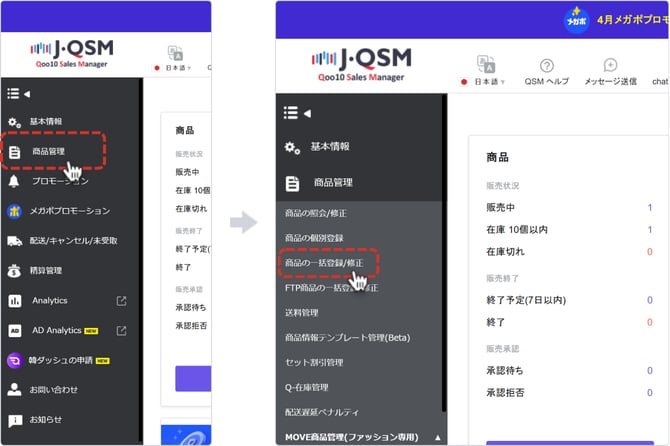 画面左側のメニューから、[商品管理] → [商品の一括登録/修正] をクリックします。