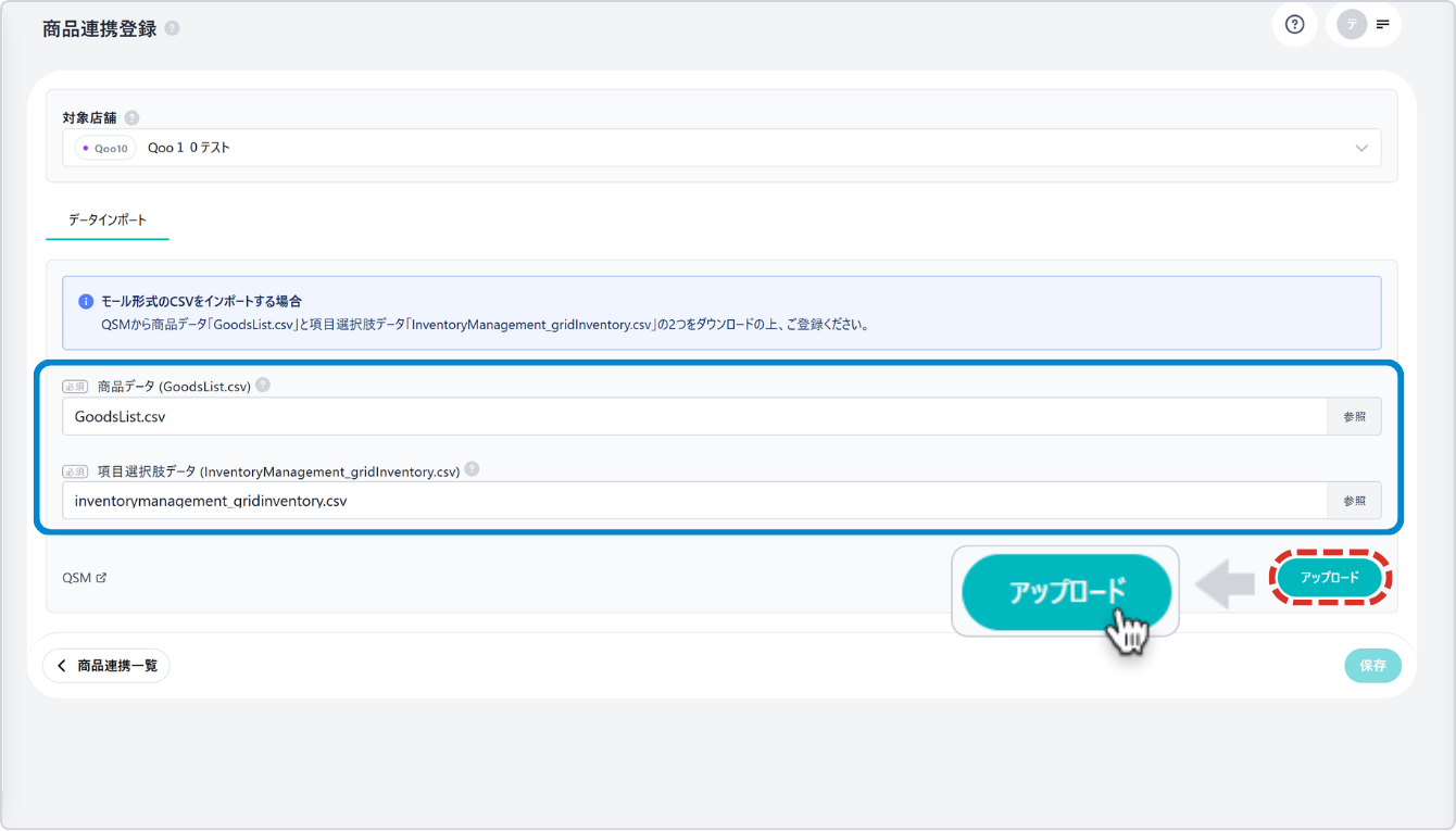 対象店舗を選択後、QSMから取得済みのファイルを指定し、[アップロード] ボタンをクリックします。