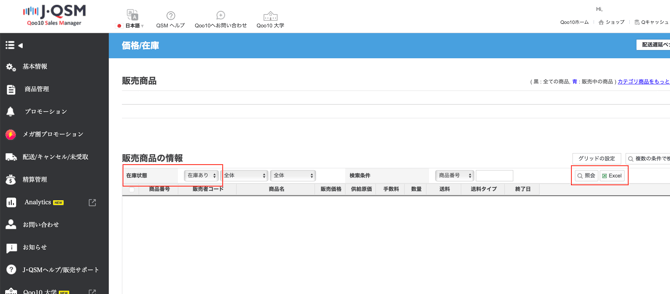 - こちらのリンク(https://qsm.qoo10.jp/GMKT.INC.Gsm.Web/Order/OrderManagement.aspx)より「価格/在庫」メニューにアクセスします。(QSM内のナビゲーションにないため上記リンクよりアクセスしてください)