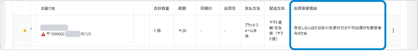 郵便番号と住所の不一致または住所に数字なし(番地抜けなど)は一覧にエラーマークが表示され出荷保留となります。