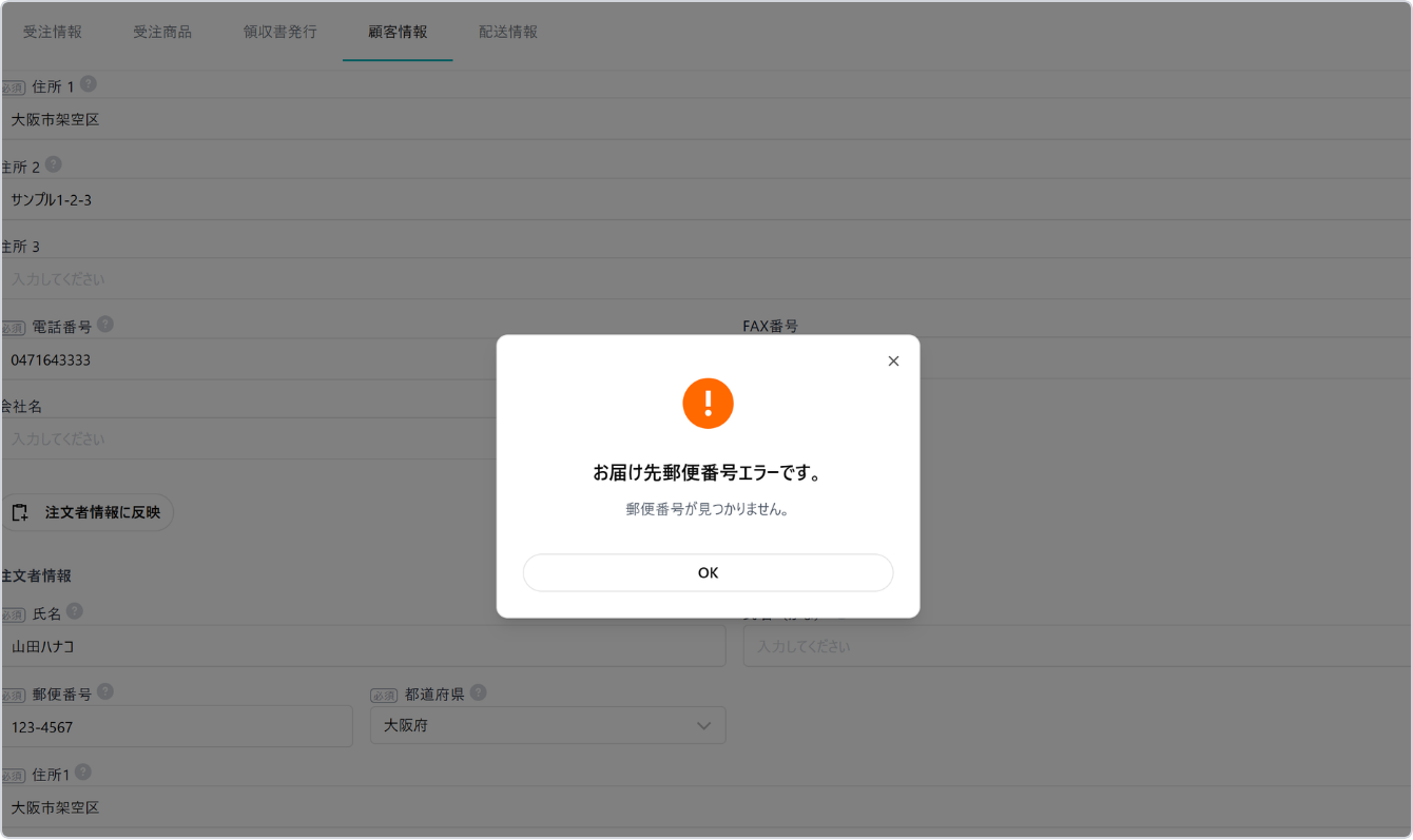 受注登録時に存在しない郵便番号は登録不可または出荷保留になります。検証の条件をご確認ください。