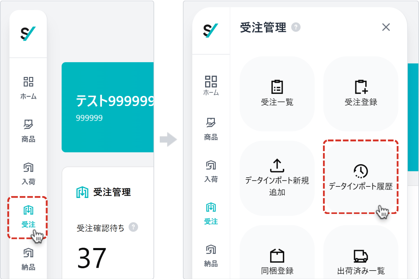 画面左側のメインメニューから、[受注] → [データインポート履歴] をクリックします。