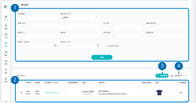 ① 受注の検索:登録されている情報をもとに、任意の条件で検索できます。