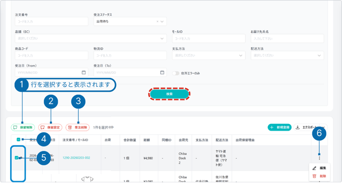 任意の検索項目いずれかを入力し、 [検索] ボタンをクリックすると、条件に一致した受注が一覧に表示されます。検索結果一覧では、以下の操作が可能です。