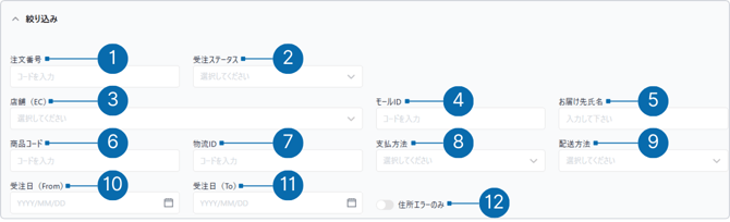 ⑫ 住所エラーのみ:トグルをON(有効)にすると、住所エラーがある受注のみを絞り込んで表示します。