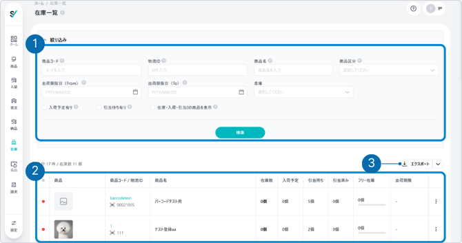 ② 物流ID:入力した値に部分一致した在庫が表示されます。
