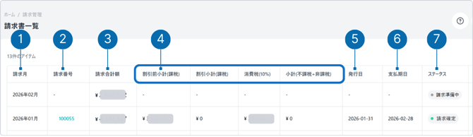一覧には、各月の請求情報が行単位で表示され、以下の操作が可能です。