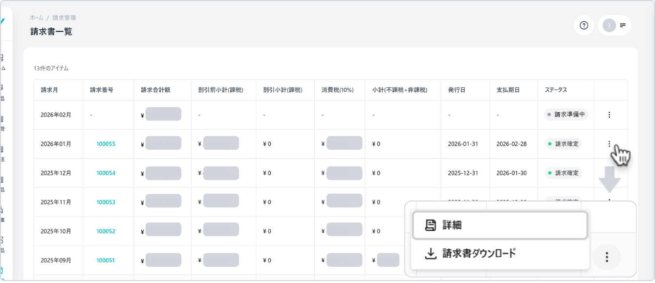 該当年月の行右端にあるMoreボタン [︙] をクリックし、表示された操作メニューから「詳細」を選択すると、請求書詳細が表示されます。