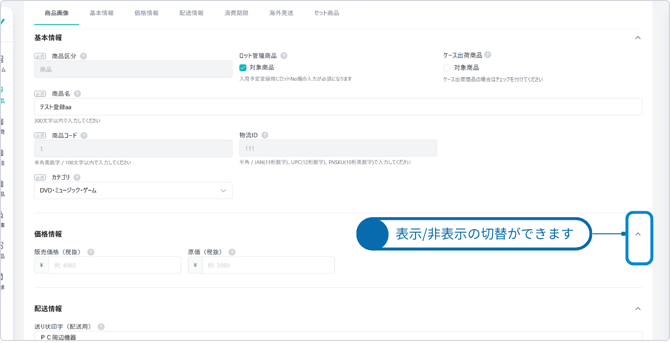 商品の管理に必要な情報を「商品」として登録できます。商品情報を登録することで、入荷~出荷などの一連の業務が可能になります。