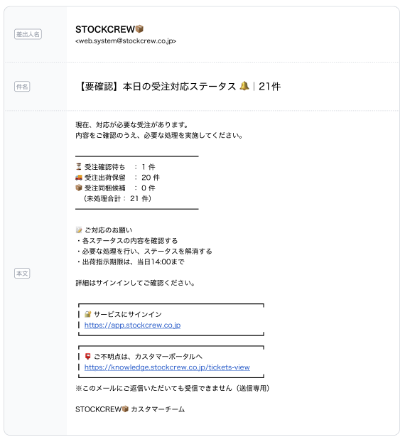 確認待ち、出荷保留、同梱処理待ちのいずれかの受注が存在する場合に配信 |