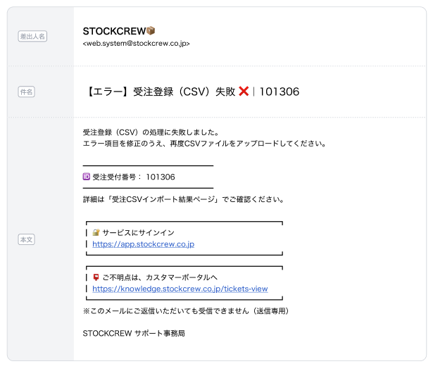 CSV受注登録が失敗した場合に配信 |