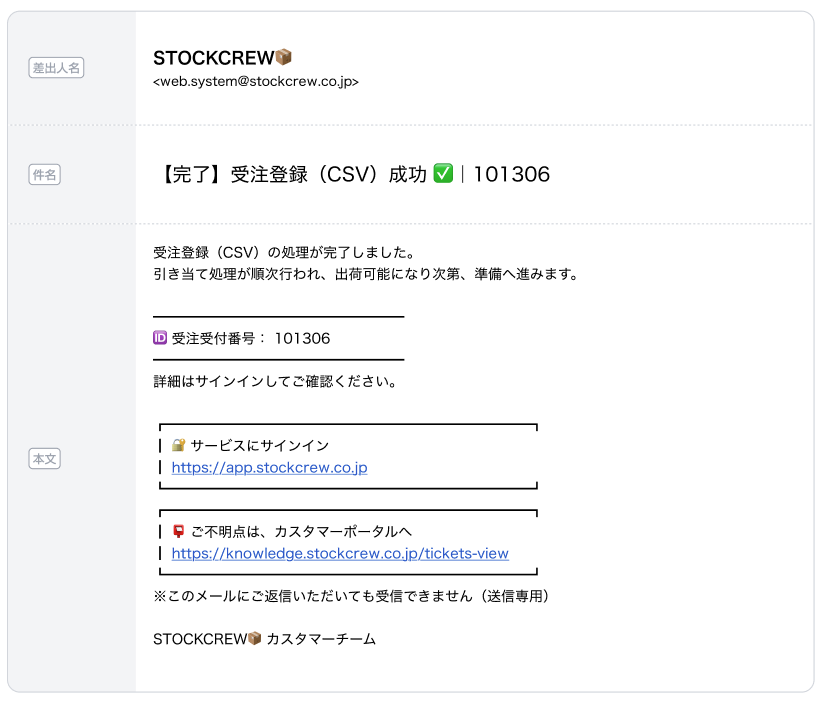 CSV受注登録が成功した場合に配信 |