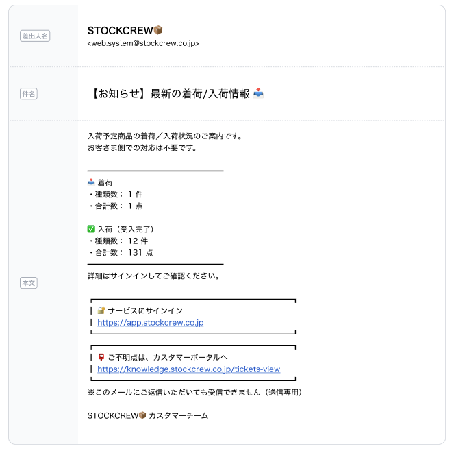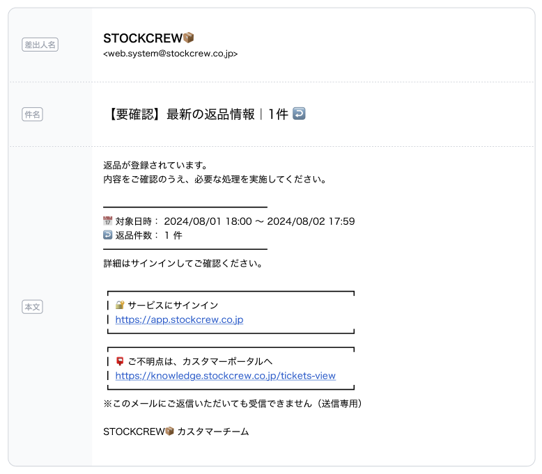 入荷・返品関連の通知