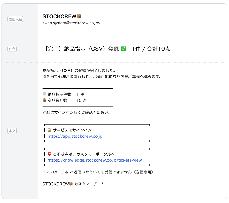 CSV入荷予定登録を行った場合に配信 |