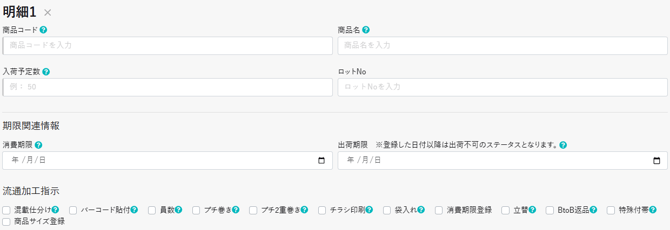 - 入荷情報入力画面にて、必要な付帯作業にチェックを入れる(複数選択可)