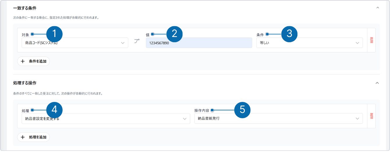 特定の商品コード(例:1234567890)が含まれる受注に対して、納品書タイプを紙の納品書に変更する例です。